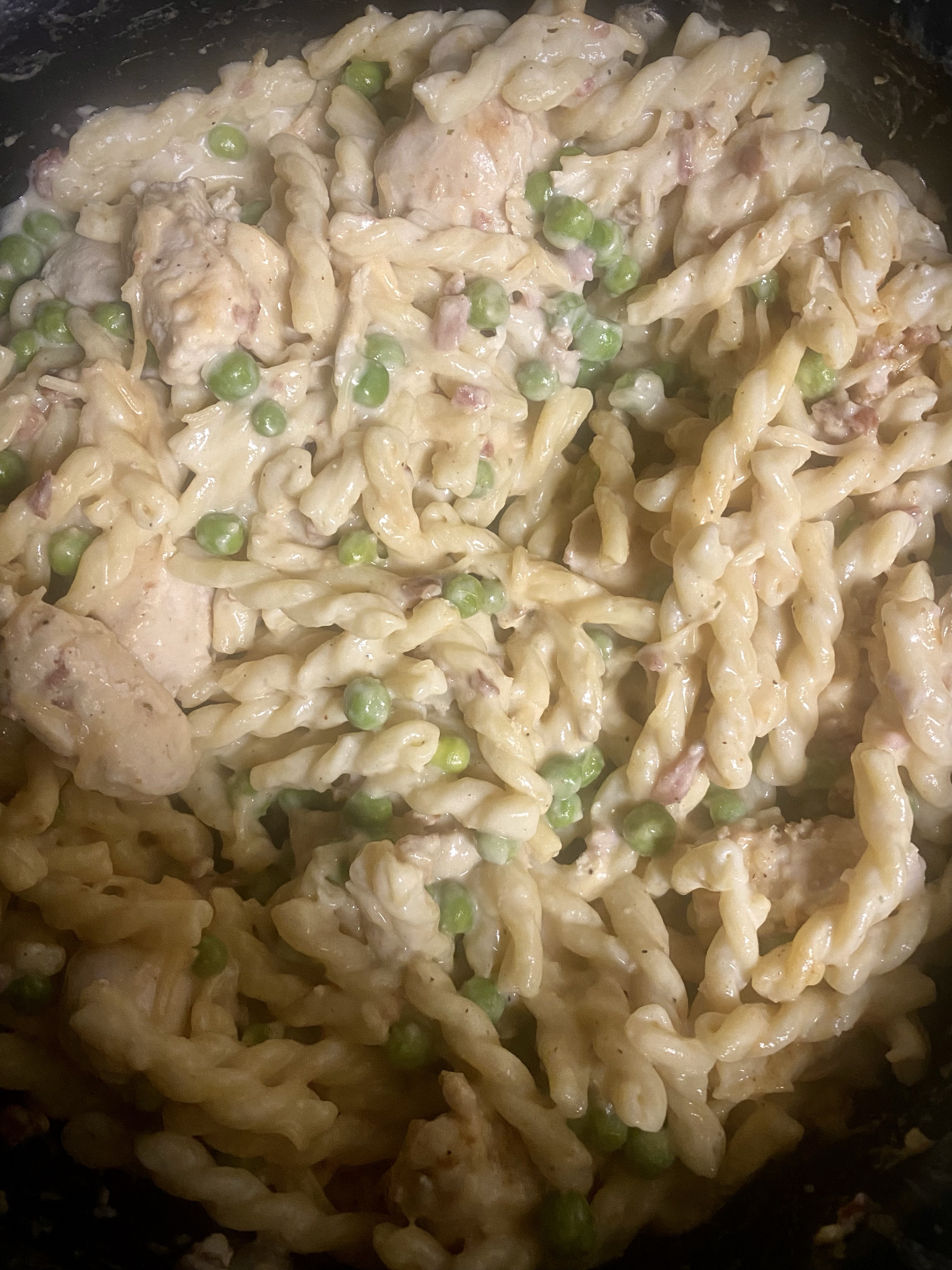 Cooking? Easy peasy. One pot and that’s my kind of cooking. I came with everything we needed: cream cheese, pasta, flour, peas, chicken broth, shredded parm, ranch seasoning, already diced boneless/skinless chicken breast (whaaat?!), and crumbled bacon.