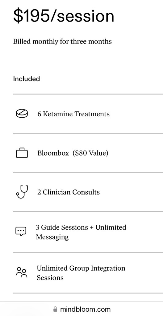 Mindbloom.com. You answer questions to see if you’re a good fit for their program and it’s far more affordable but it’s also sublingual vs IV.